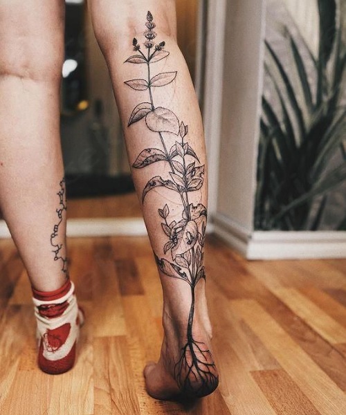 This one is a creative art piece that starts at the heel and grows all the way up your leg. Perfect as a symbolic piece.