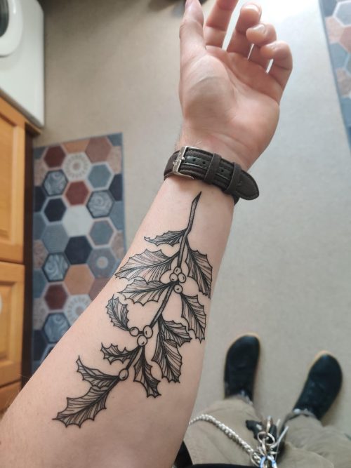 Consider this black and grey mistletoe stem tattoo for your hand. It is the perfect Christmas-themed forearm tattoo.
