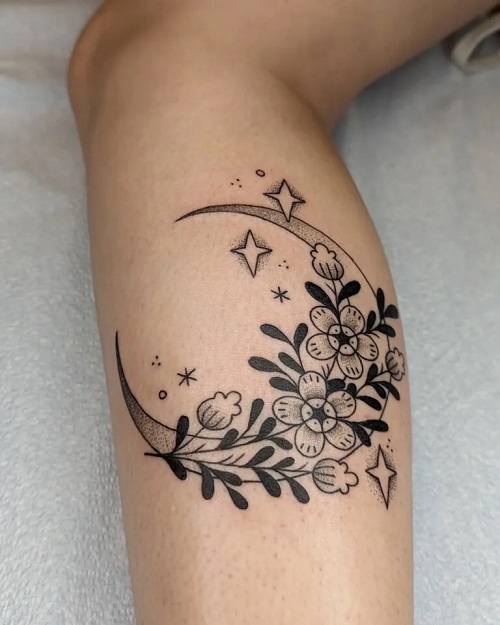 Here’s a creative tattoo for you. The flowers adorning the moon are a beautiful piece surrounded by stars. Won’t you agree?