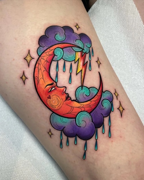 Look at this colorful tattoo idea. It’s beautifully aesthetic, and the animated thunderbolt with the spiderwebs on the moon is simply the best!