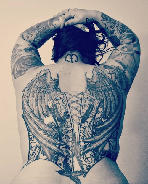 Go ahead with a corset body engraving that encourages us to ‘Let your wings spread and imagination fly.’