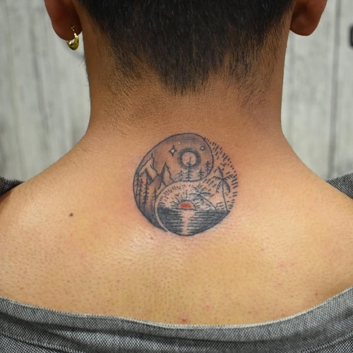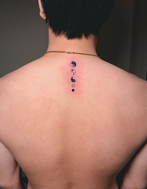 The yin and yang are beautifully presented in this back tattoo. It is made in bold black ink, allowing you to see every detail vividly.