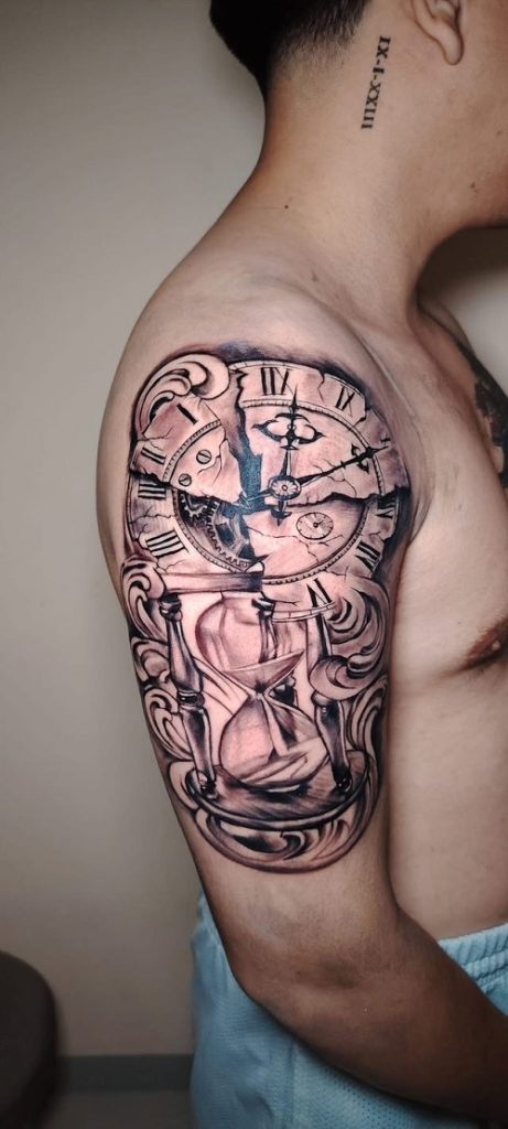 What does a clock and hourglass tattoo like this mean? It symbolizes the meaning of time’s inevitable passage and the urgency to live life fully.
