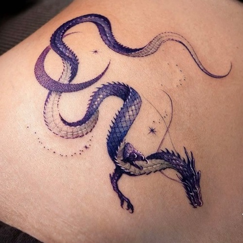 Simply a beautiful dragon tattoo done in purple, representing power, strength, wisdom, and protection. What do you think? Did it catch your eye?