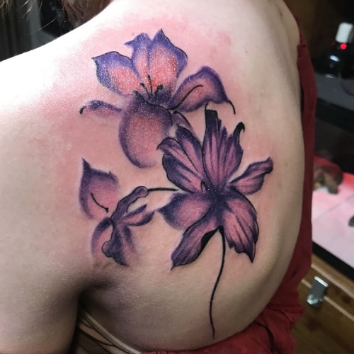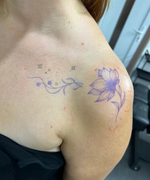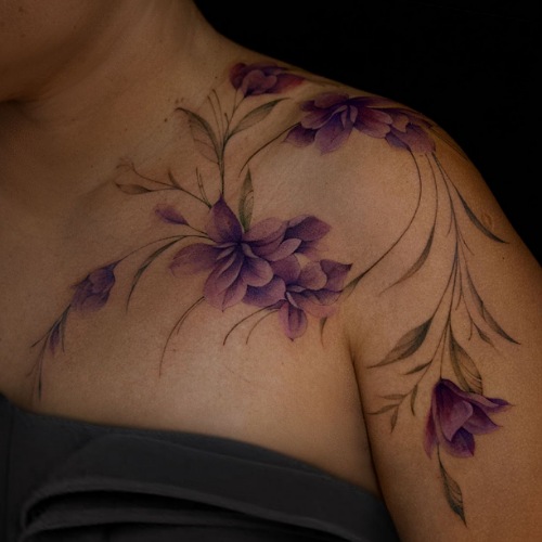 Take a look at this stunning purple floral design on the shoulder. It is whimsical and perfect for a feminine look.