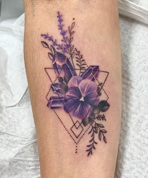 Let’s end this guide with a purple crystal heart decorated with flowers. Isn’t this a mesmerizing way of getting a new tattoo?