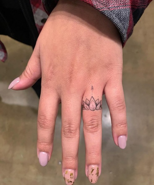 Here is a lotus tattoo ring for your beautiful fingers, symbolizing purity, inner peace, and strength.