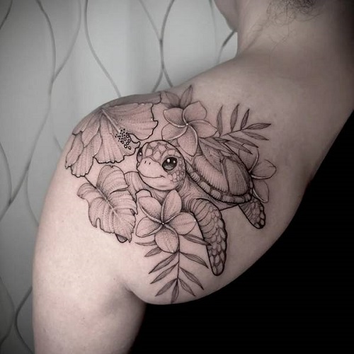 Another beautiful shoulder tattoo featuring a baby turtle with stars in its eyes. The added flowers add a natural charm to it.