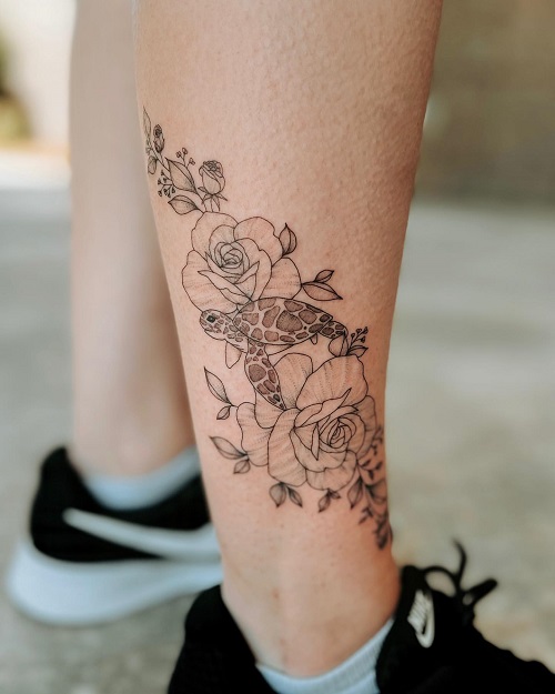 Do you love intricate details and fine-line designs in your tattoo? If yes, then check out this turtle on the ankle covered in roses.