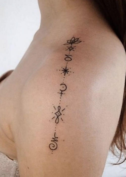 The second design runs along your shoulder, featuring a tiny lotus and an unalome.
