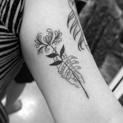 Dainty and slender skeletal fingers hold out a flower, making this tattoo a beautiful and feminine choice.