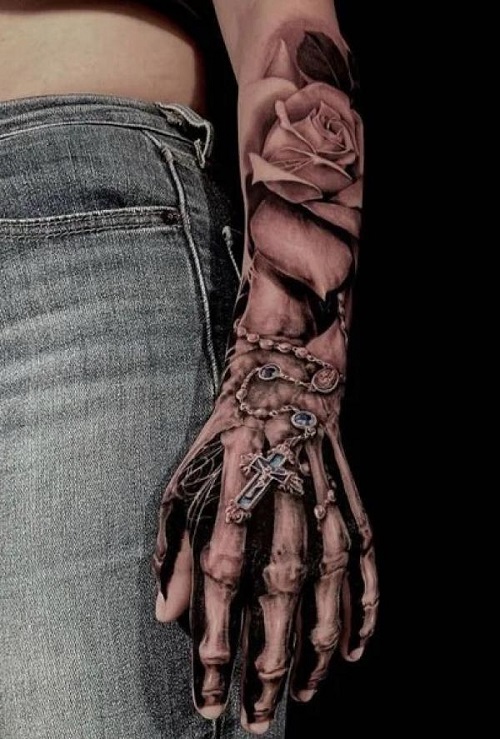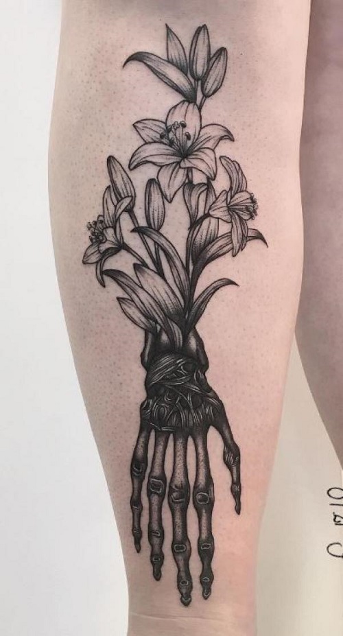 Go ahead with this tattoo, which features lilies growing from a skeletal hand, symbolizing the balance between life and death.