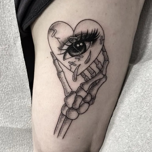 Just a tattoo that perfectly shows a skeletal hand holding out a broken heart with teardrops representing a fractured soul.