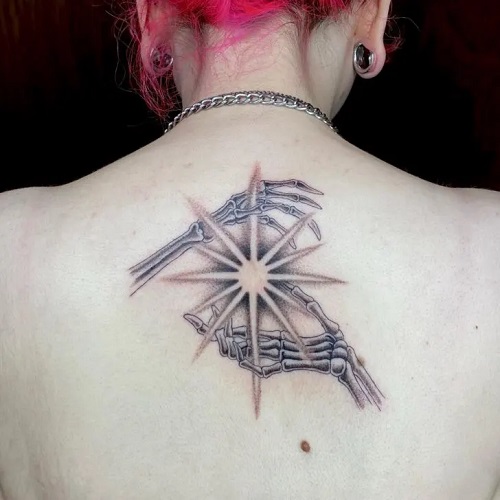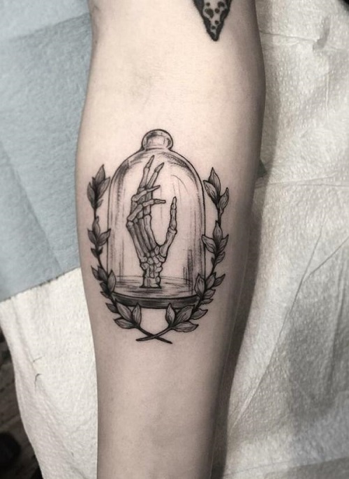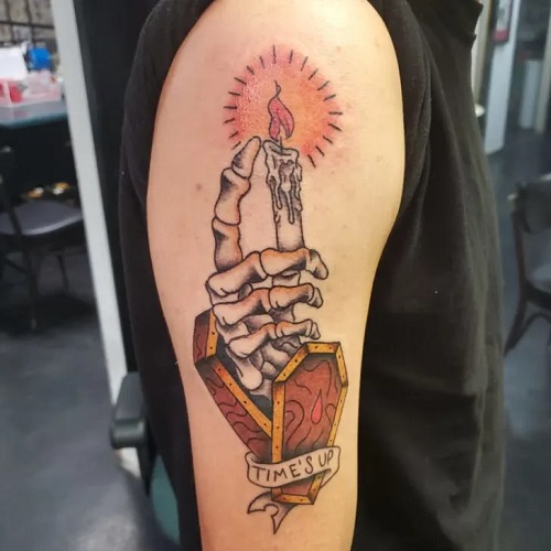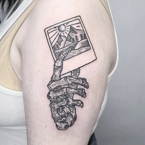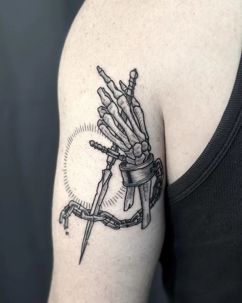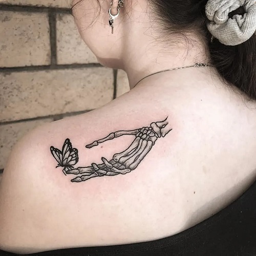 For those who prefer a meaningful shoulder tattoo, this one’s a great choice. It shows a skeletal hand reaching for a butterfly, symbolizing the reach for freedom.
