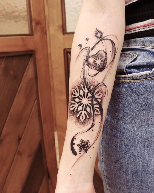 Snowflake tattoos symbolize purity and innocence, and personal significance. Combine it with a heart, star, and semicolon to form this beautiful sleeve.