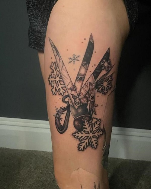 If you thrive in the snow and often travel the world, this thigh-ink design is for you.