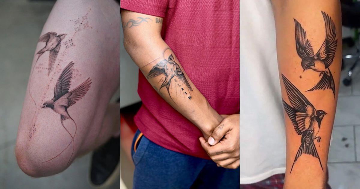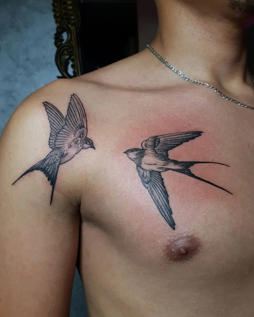 Go ahead with this duo of sparrows, one on your shoulder and the other on your chest. It will surely become a memorable piece.