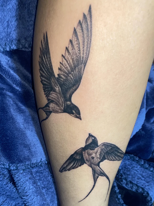 Do not look further if you wish for a tattoo that is symbolic of safe travels and freedom. This minimal sparrow sleeve is simply perfect.