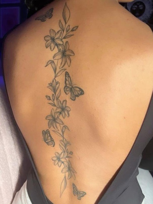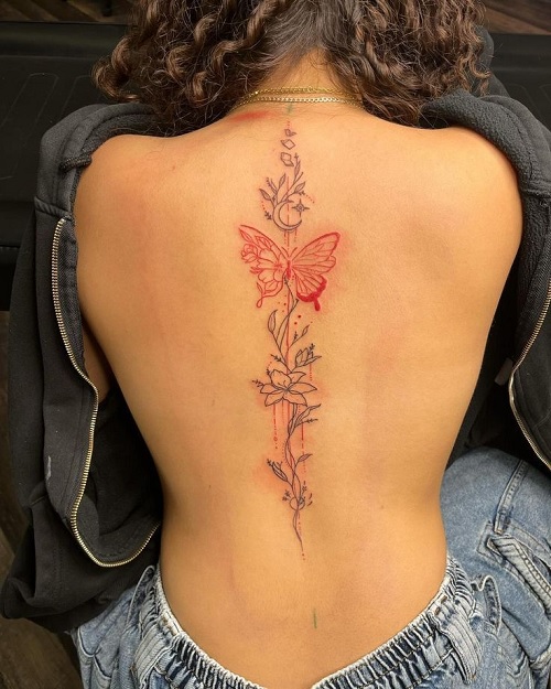 Capture the beauty of nature in this tattoo, where butterfly and floral motifs come together. Getting a back tattoo with such an inspiring design is a wonderful choice!