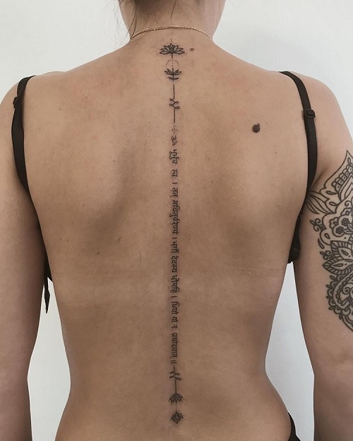 A super cool arrangement of mini unalome, lotuses, and the Gayatri Mantra is seen in this intricately done spine art. Isn’t it an attractive piece?