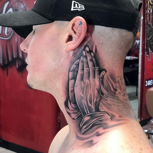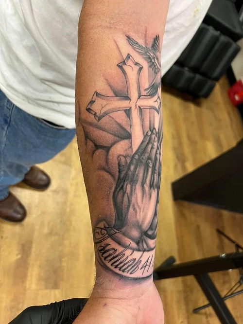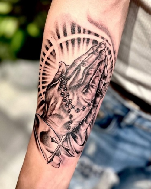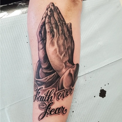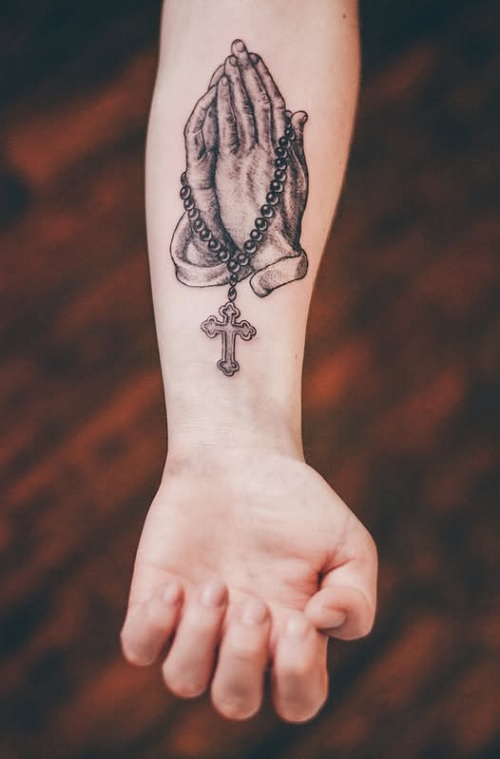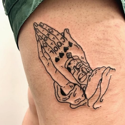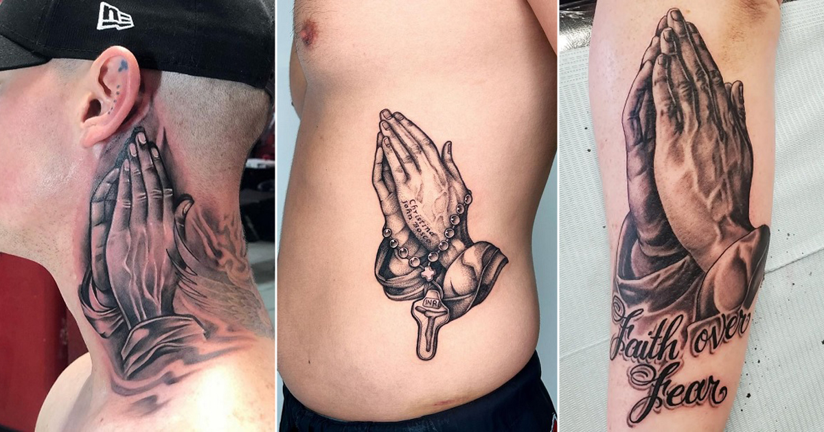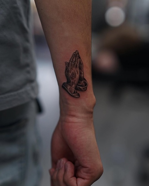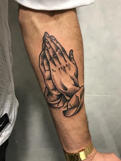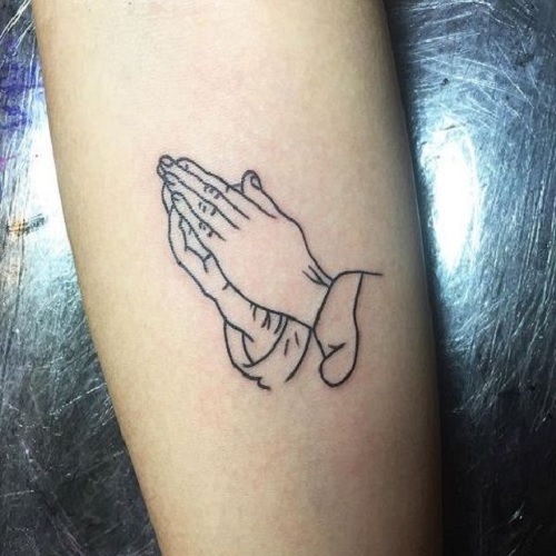 Just a simple praying hands tattoo that embodies the concept of faith and prayer. Don’t think too much; just do it if you find it attractive.