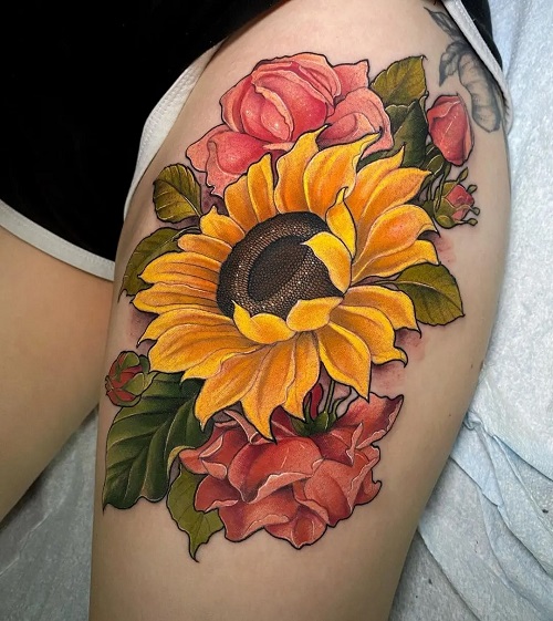 Add colors to your life with this bold, colorful flower tattoo that will look good on your thigh.