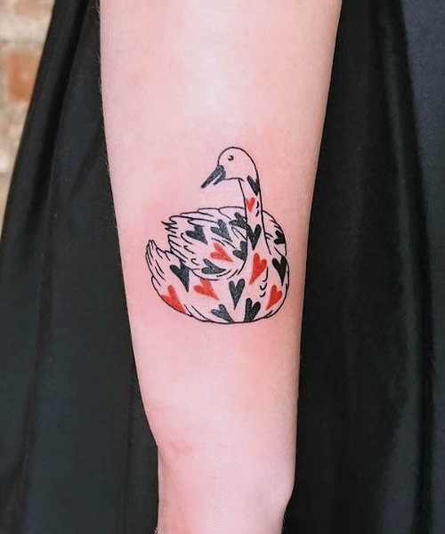 Getting a minimalistic swan on the forearm that is covered in hearts might be one of the best ways of getting a tattoo.