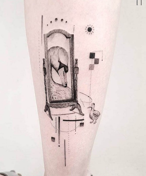 A tattoo idea that shows a baby swan looking into the mirror to see the graceful swan looking back is a symbol of how we age gracefully.