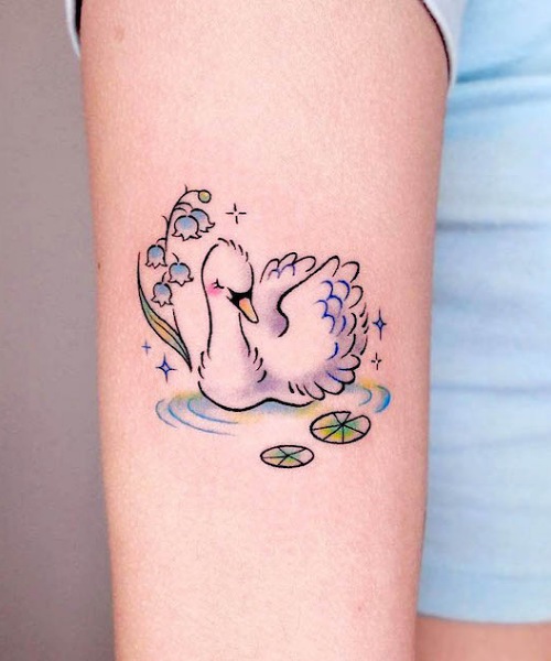 A drawing style swan shown swimming in the water with lotus leaves and lily of the valley beside it makes for a great first tattoo idea.
