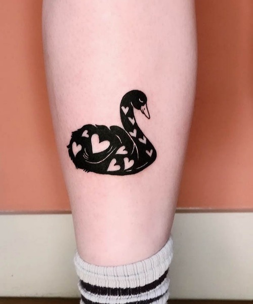 The swan is a symbol of love, loyalty, and transformation, and what could be a better representation than this black-ink leg tattoo?