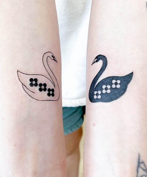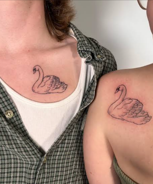 Dainty and simple, this matching swan tattoo is a nice way to get a couple tattoo done that will stay with you forever.