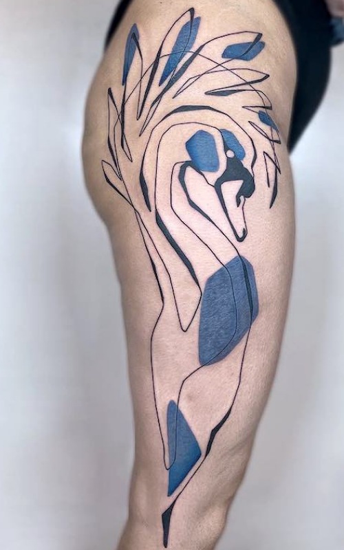 Starting strong with a full-leg tattoo that has a cool swan illustration done to make every step graceful.