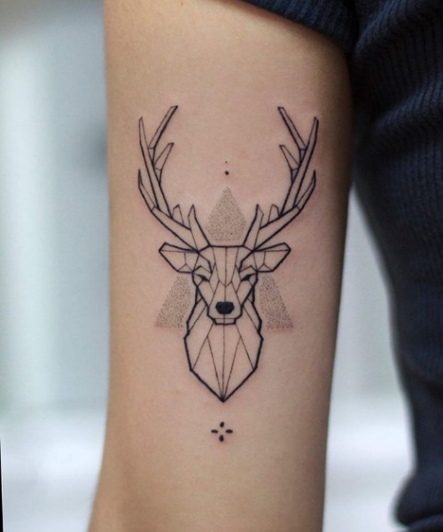 A stunning geometric tattoo, this piece of art uses sharp lines and triangles, and the deer in the center can often symbolize inner power, protection, and resilience!