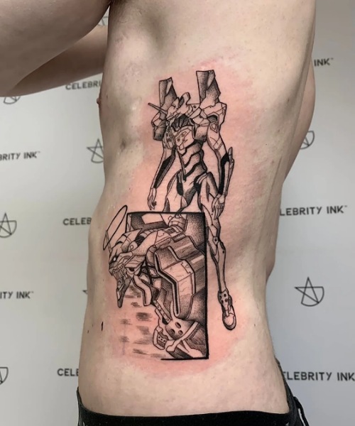 Standing tall as a side-body art, this illustrative style sketch tattoo depicts the Evangelion unit. It’s popular among fans of EVA Unit-01!