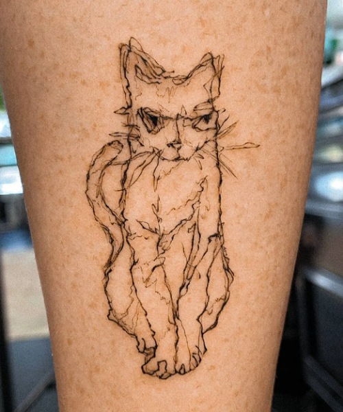 Cats are known to carry an element of mystery! This pretty sketch tattoo in an abstract minimal art style captures the cat’s grumpy and serious expressions very well.