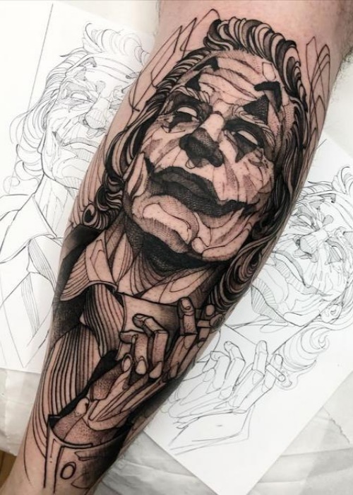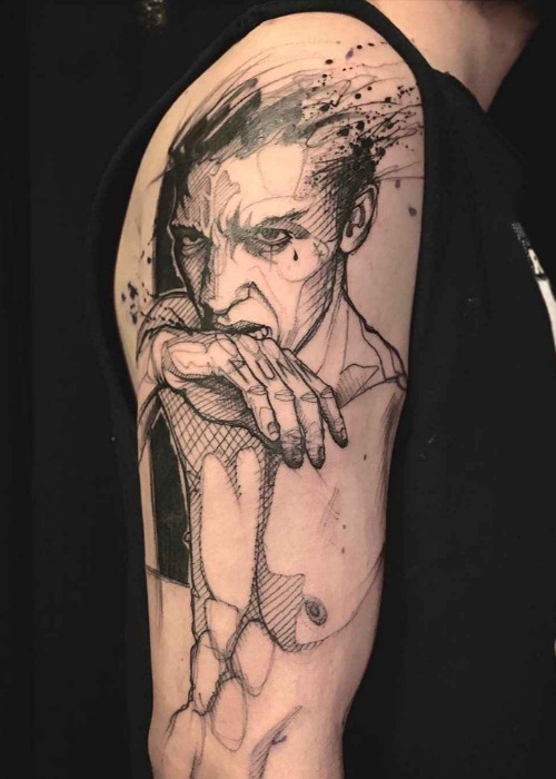 You cannot miss this one if you’re a Joker fan! This sketch tattoo in black-and-gray realism style depicts the facial expressions and makeup of the character very well.