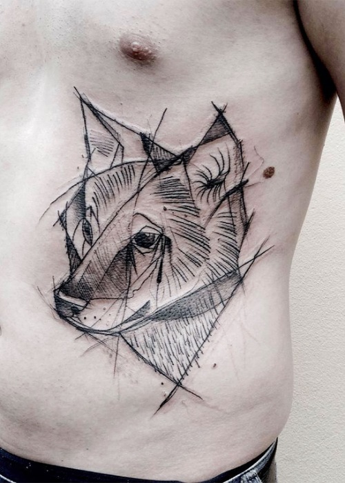 Irregular lines and shading make this wolf head tattoo stand out on the torso. This sketch tattoo is modern and artistic because of the expert use of line work.