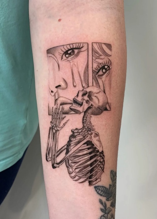 A modern blend of surreal crying eyes and a realistic skeleton, this is a personalized piece of body art that is intriguing and stirs strong emotions of strength and hardships.