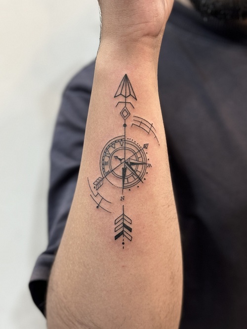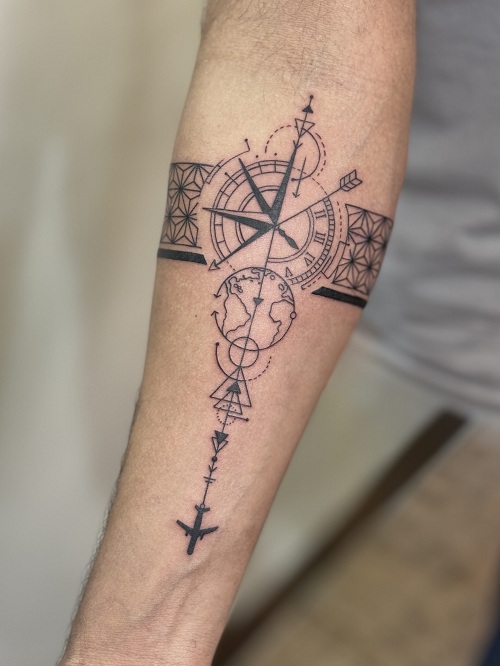Don’t lose your way with this compass tattoo paired with a globe and an airplane tattoo. Perfect for travelers.