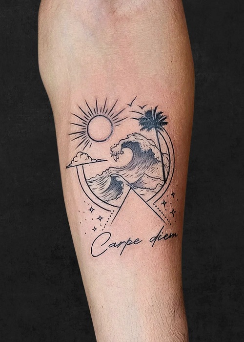 Make the most of the present and worry less about the future with this ocean-themed “Carpe diem” body art.