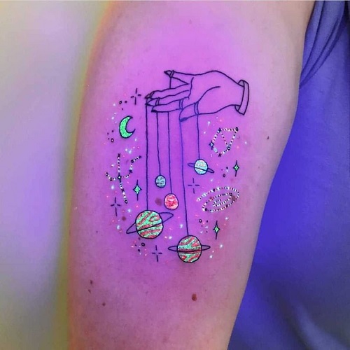 Let’s pair up your favorite planet, Saturn, in this lovely style as it dangles down from a feminine-looking hand. The addition of the moon and stars makes it the perfect galaxy ink.