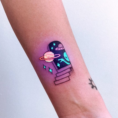 This UFO ink design is a lovely option for women who want to showcase their artistic side and love for intricate patterns. Plus, it is also Halloween-themed. Don’t you think?
