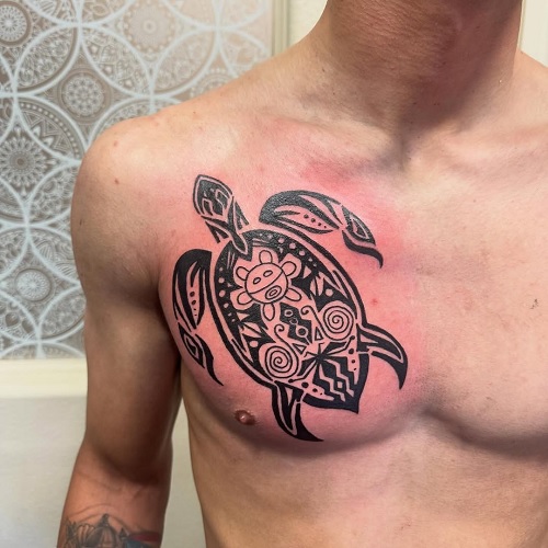 The turtle is a symbol of longevity, wisdom, and protection, and what could be a better representation than this beautiful art? See more chest tattoo ideas right here!