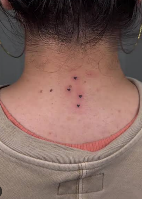 Yes, of course, you can get inspiration for a heart freckle tattoo on the back of your neck. Here’s one for you.