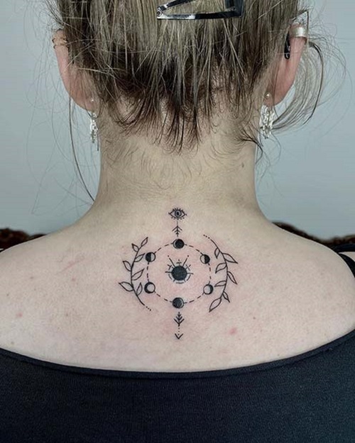 For those who find serenity in precision, this tattoo design is ideal. With crisp lines, perfect circles, and arcs, it shows the moon’s journey through the sky in a series of angles and shapes.