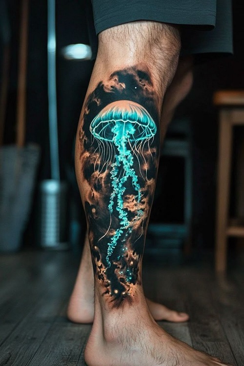 This beautiful art blends darkness with the beauty of jellyfish, using the color blue. If this is your thing, then be sure to check out our guide to cyber sigil tattoos.