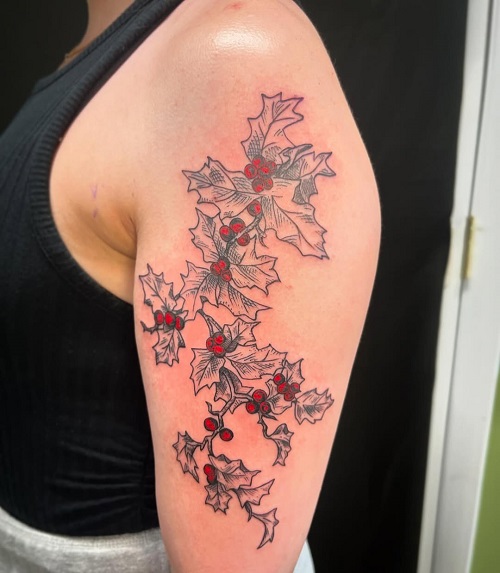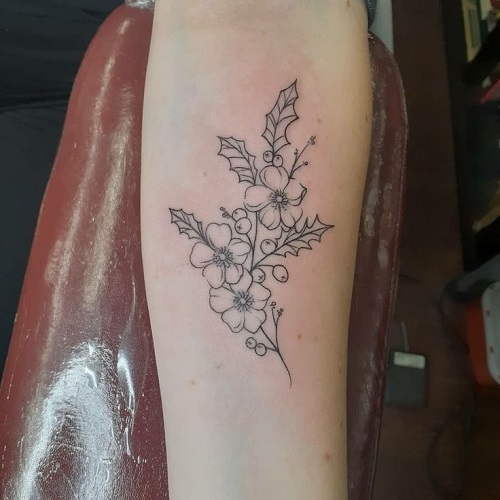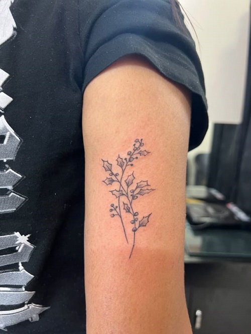Design-wise, holly works beautifully in curved placements: around the wrist, on the upper arm, or just below the ribs. Its leaves naturally create flow, allowing artists to frame it along the body’s lines. You can go for a soft black-and-grey approach if you want something calm and symbolic.