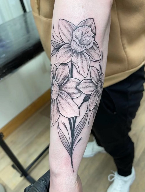 The Narcissus looks great along the forearm, collarbone, or ankle because its slim stems and balanced petals work well in slightly curved designs. A fine-line version feels gentle and personal, while a somewhat larger piece allows shading to bring out the petals’ layers.