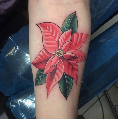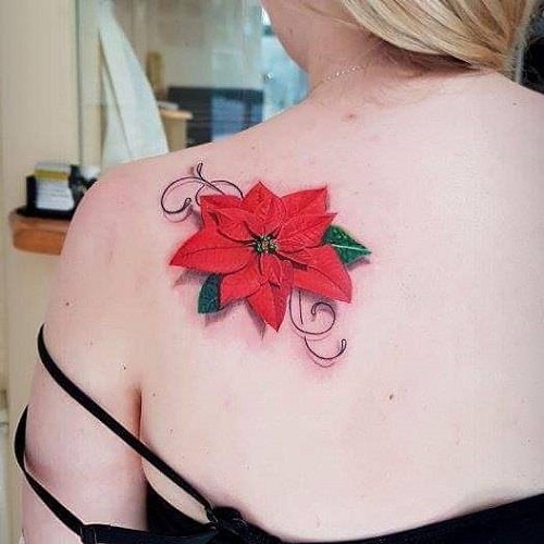 It has layered leaves that open outward and works best in placements that offer enough space, like the upper arm, shoulder blade, thigh, or side torso. A fine-line outline can give it a graceful look, while a fuller shaded piece highlights its shape. Even without heavy colour, the poinsettia’s form is recognisable and conveys its meaning clearly.