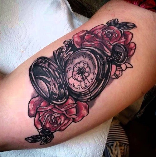 Let’s be honest. Who doesn’t love some pretty colorful flower tattoos? It gets even better when paired with the antique pocket watch.